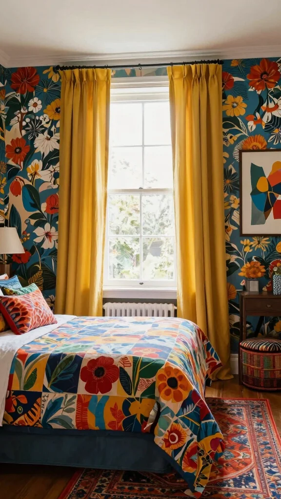 Why not embrace bold patterns with your mustard yellow curtains? They can anchor a room filled with vibrant prints, adding a cohesive touch to eclectic decor.