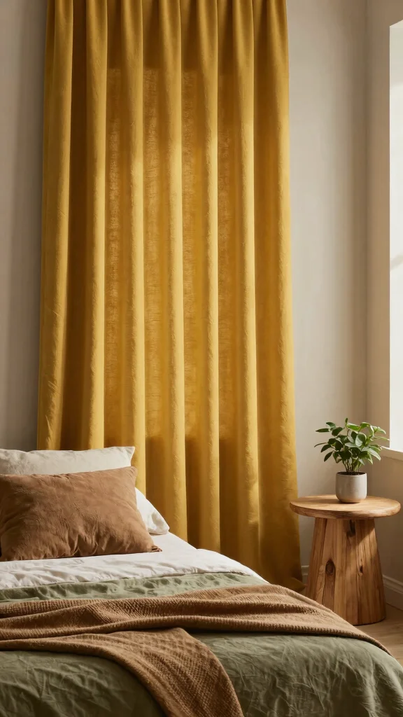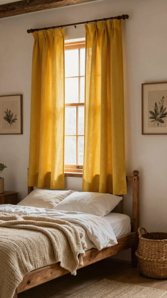 Pairing mustard yellow curtains with earthy tones creates a serene retreat that feels refreshingly cheerful.