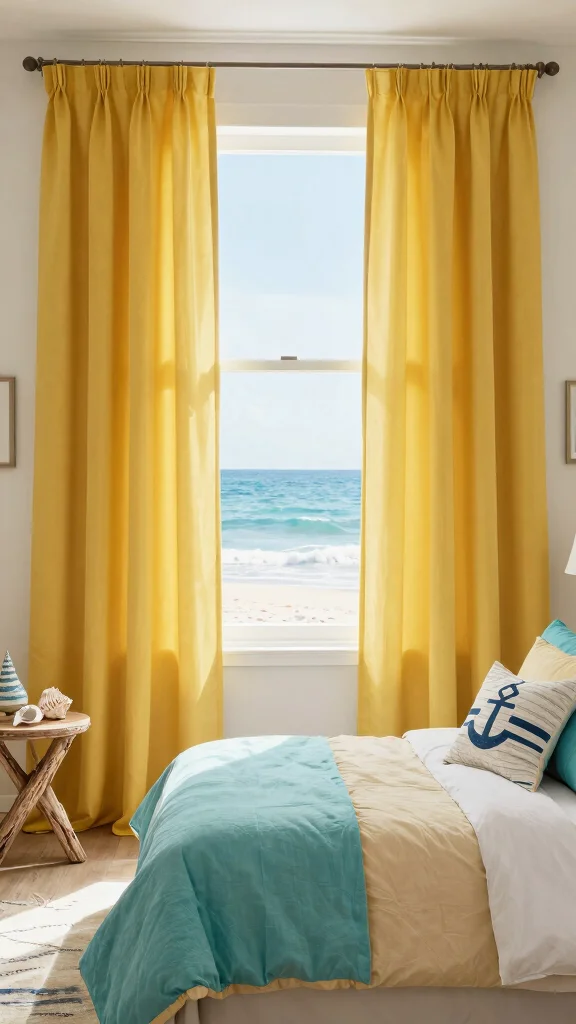 Bring a refreshing coastal vibe indoors with mustard yellow curtains that resonate with a beach-inspired theme.