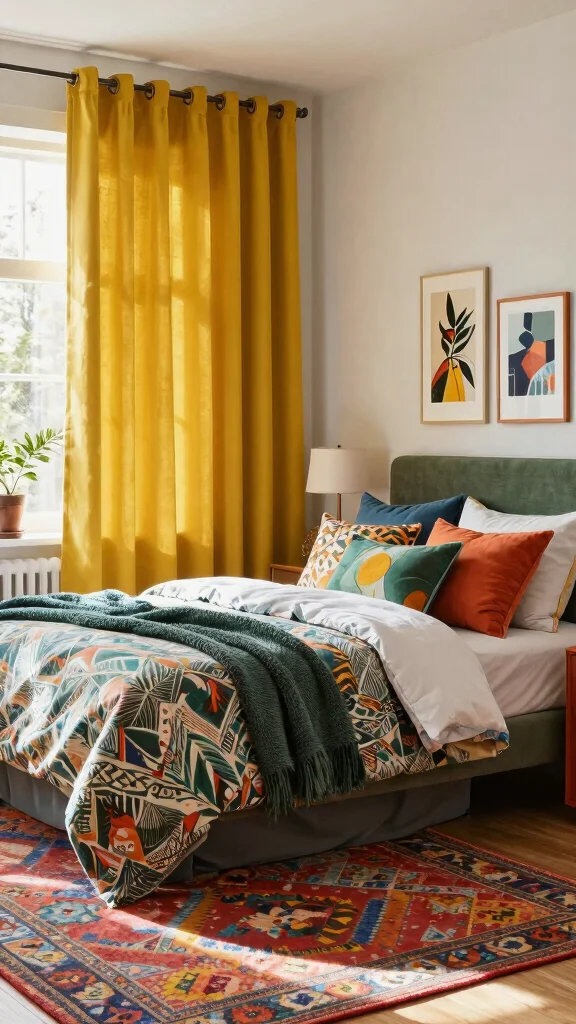 Question: How can I use mustard yellow curtains bedroom to create a cheerful Bohemian vibe?