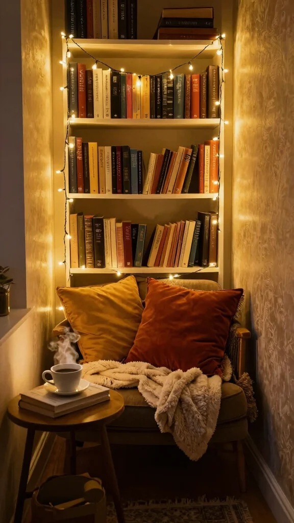 Use string lights to create a whimsical atmosphere, perfect for reading or relaxing in your nook.