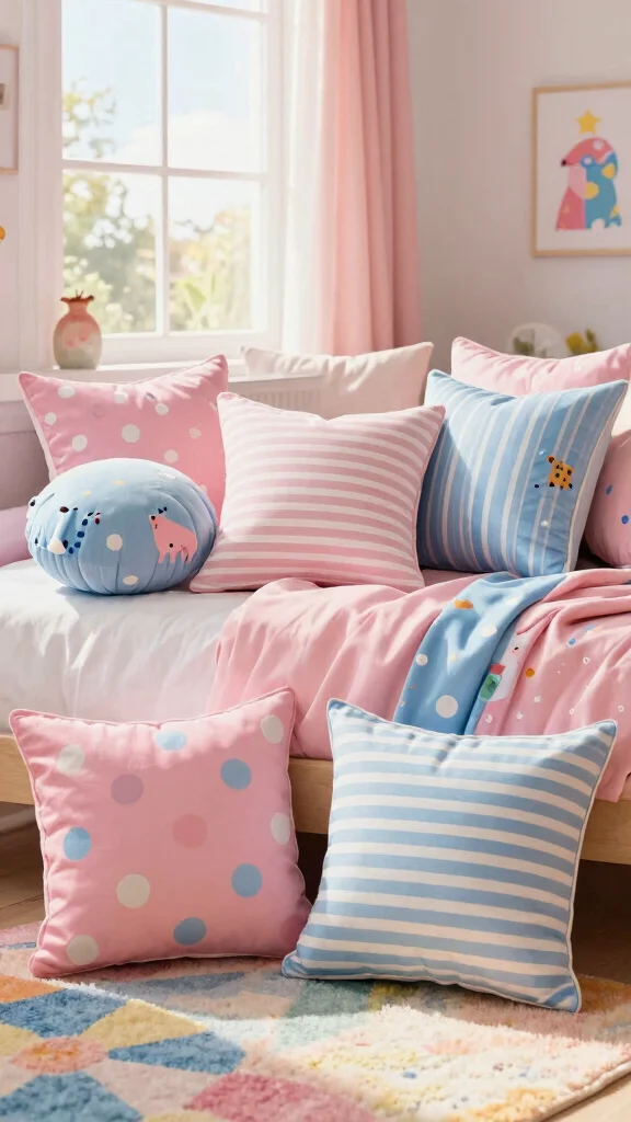 Choose pink and blue throw pillows with fun patterns to create a vibrant and playful atmosphere in your child’s bedroom.