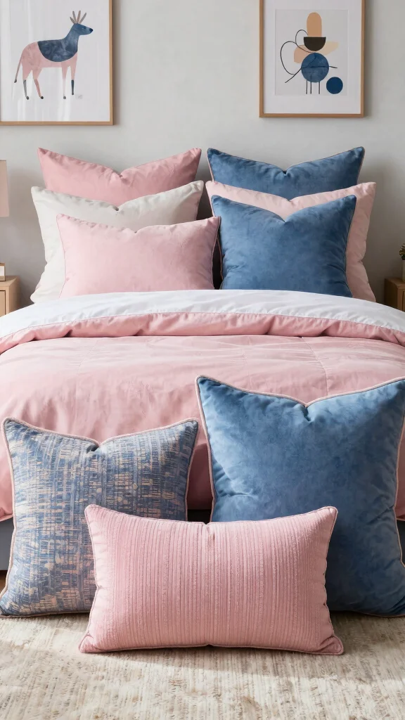 Place pink and blue throw pillows where they’ll be seen and used: a bright focal stack on the bed, a cozy reading chair, a window seat, or the living room sofa as living room accessories that tie the space together.