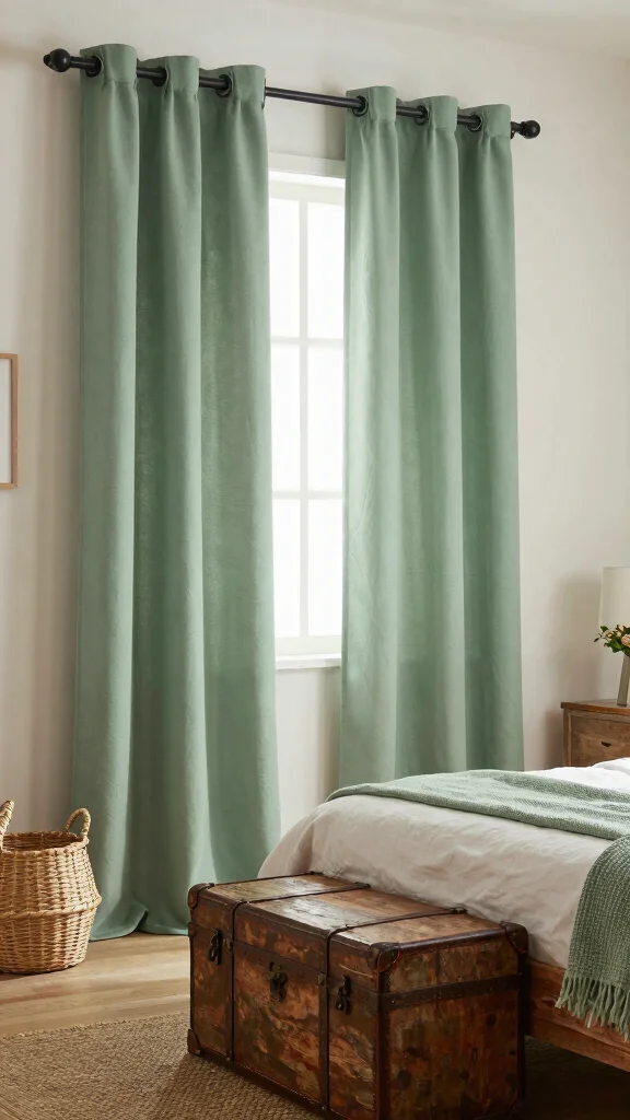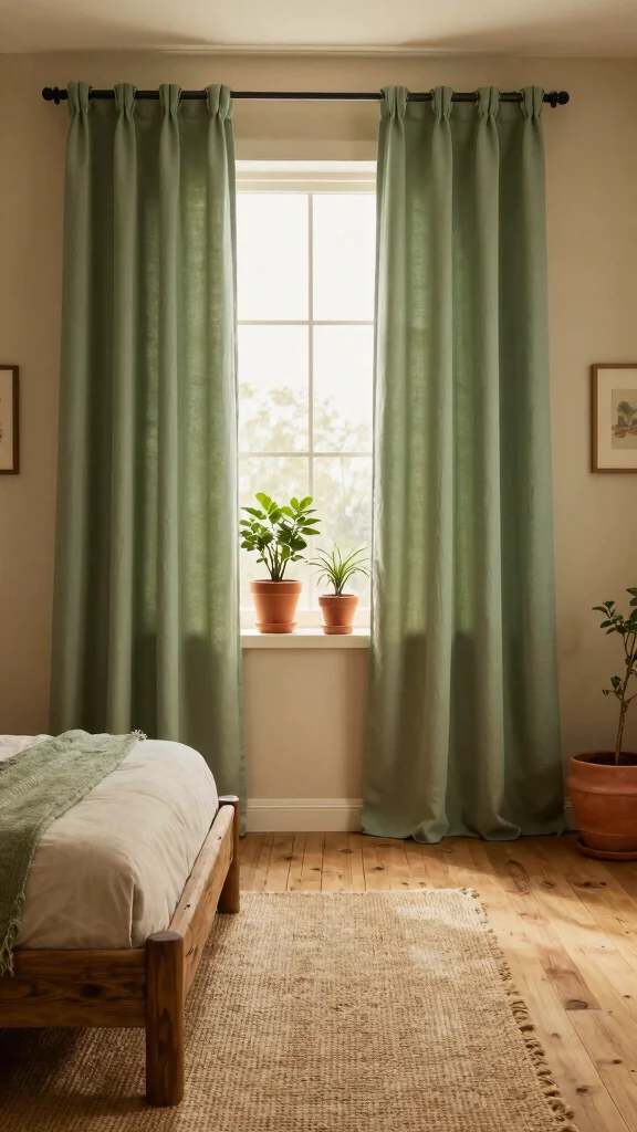 Enhancing the organic vibe of your bedroom is easy when you pair sage green curtains with earthy accents. Think of terracotta pots, jute baskets, and wooden furnishings that celebrate nature’s beauty. This combination highlights the green tones of your curtains while grounding the overall look of your space.