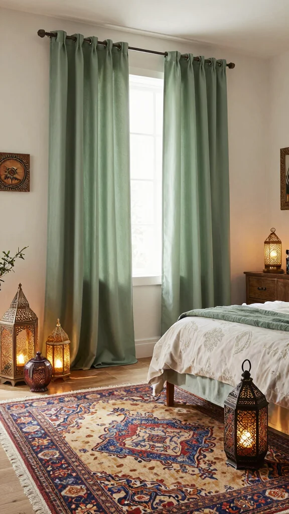 Incorporating global influences into your bedroom design celebrates diversity while using sage green curtains as a base. Look for textiles, patterns, and decor elements that represent different cultures, like Moroccan lanterns, Indian block prints, or Japanese ceramics. This blend of elements creates a unique, eclectic atmosphere that’s both inviting and adventurous.