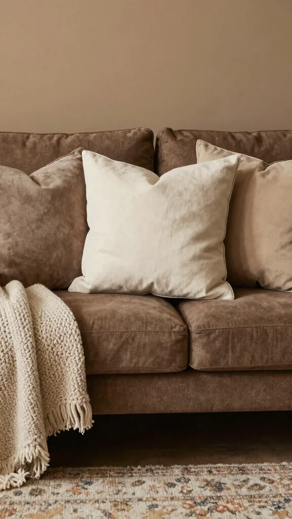 Start with a warm base like creams, taupes, or sand on your brown couch.