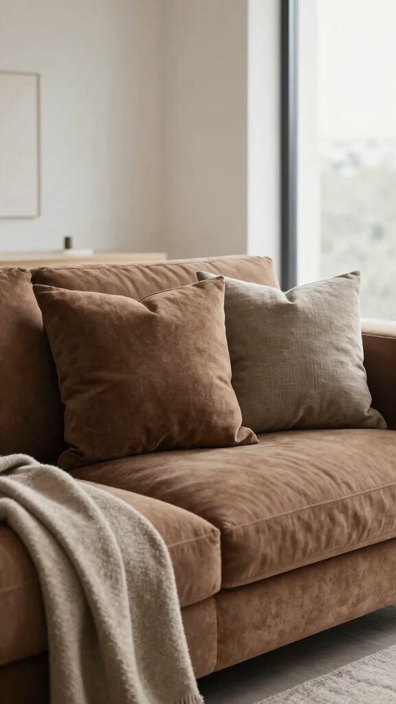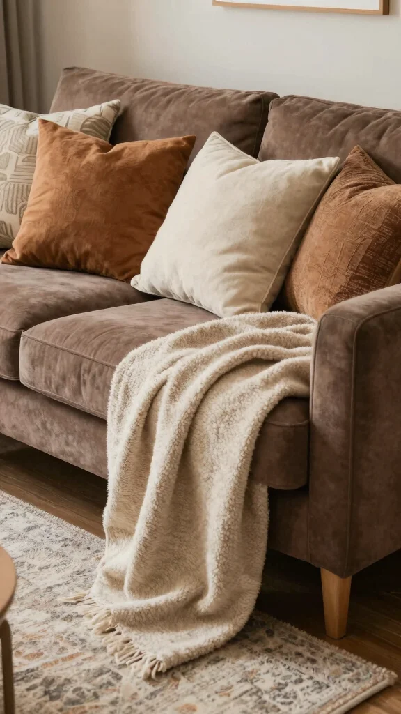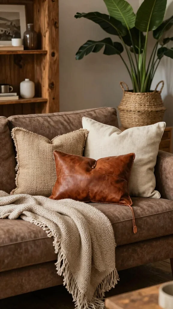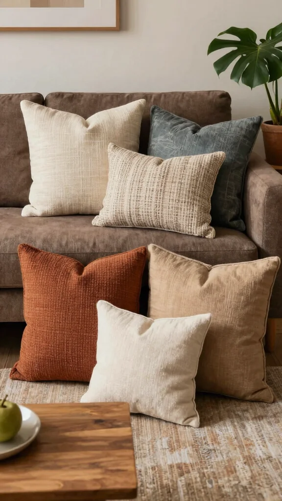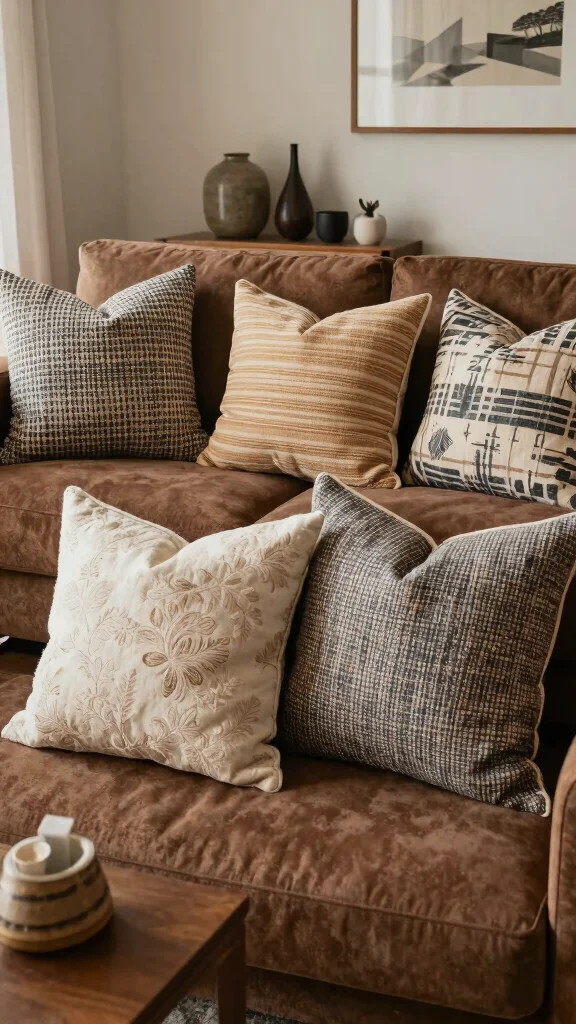 Start with a collection of textured neutral pillows that beautifully enhance the rich tones of your brown couch. Soft shades like cream, taupe, and beige can infuse the space with warmth while keeping it visually appealing.