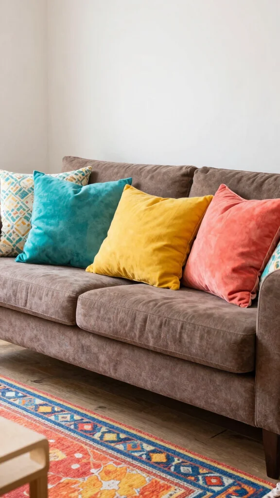 Add throw pillows with vibrant colors to create a striking contrast against the brown couch for an inviting look.