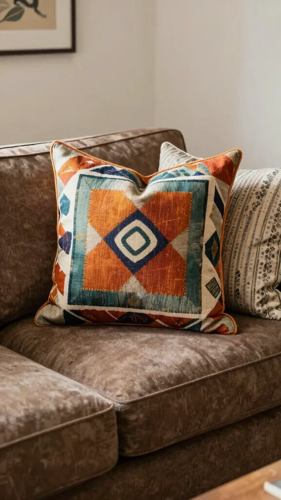 Fun fact: when layering patterns on a brown couch, three prints is the sweet spot. A dominant pattern with two echoing accents creates balance and cozy warmth in seconds.
