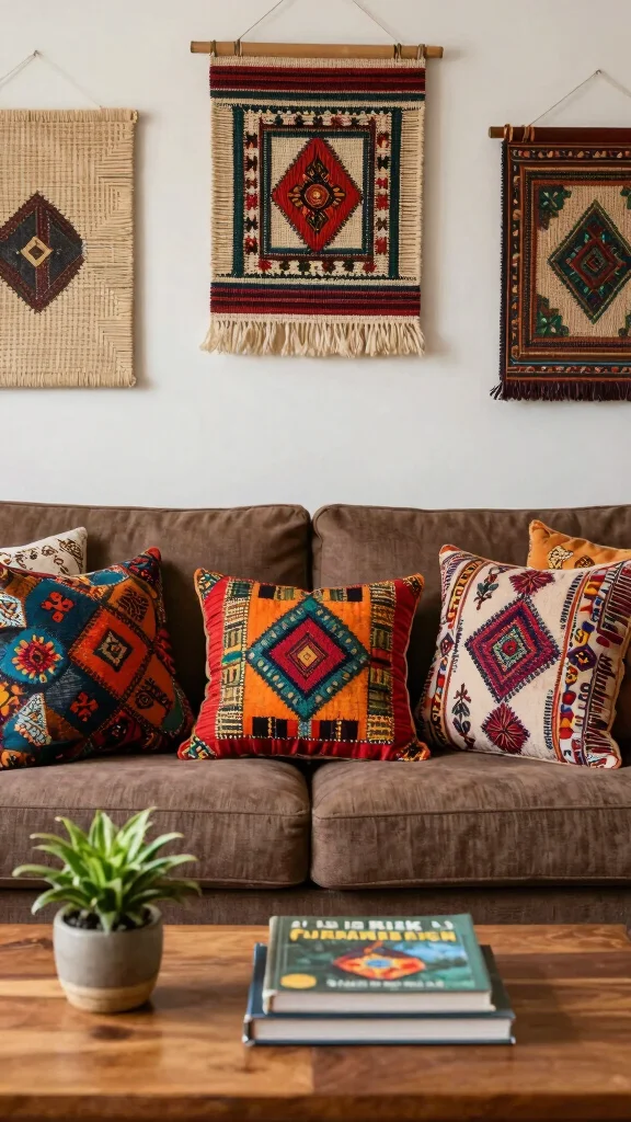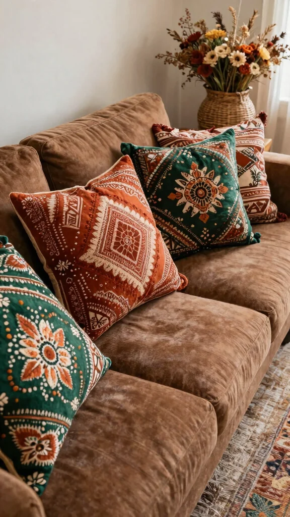 Incorporate earthy bohemian patterns to enhance the natural feel of your space and complement the brown couch.