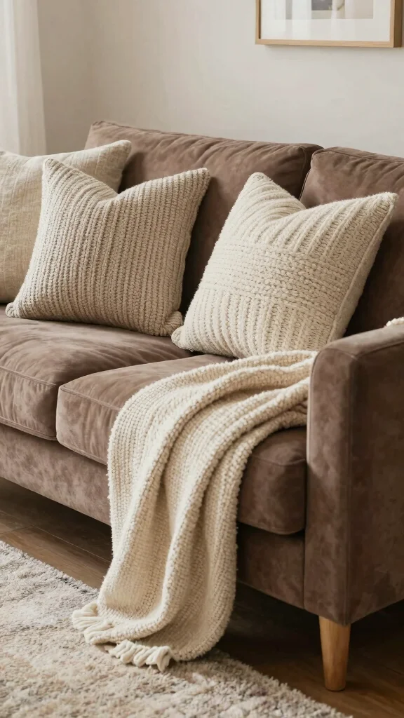 Combine various neutral textures in your throw pillows to create depth and warmth on your brown couch.