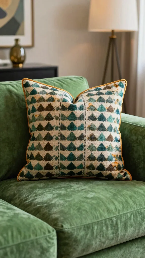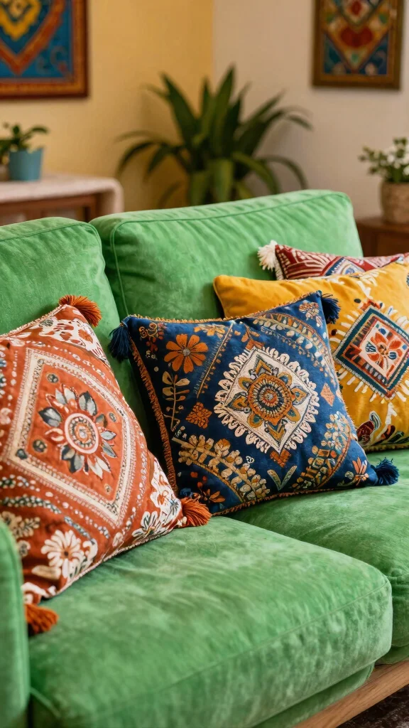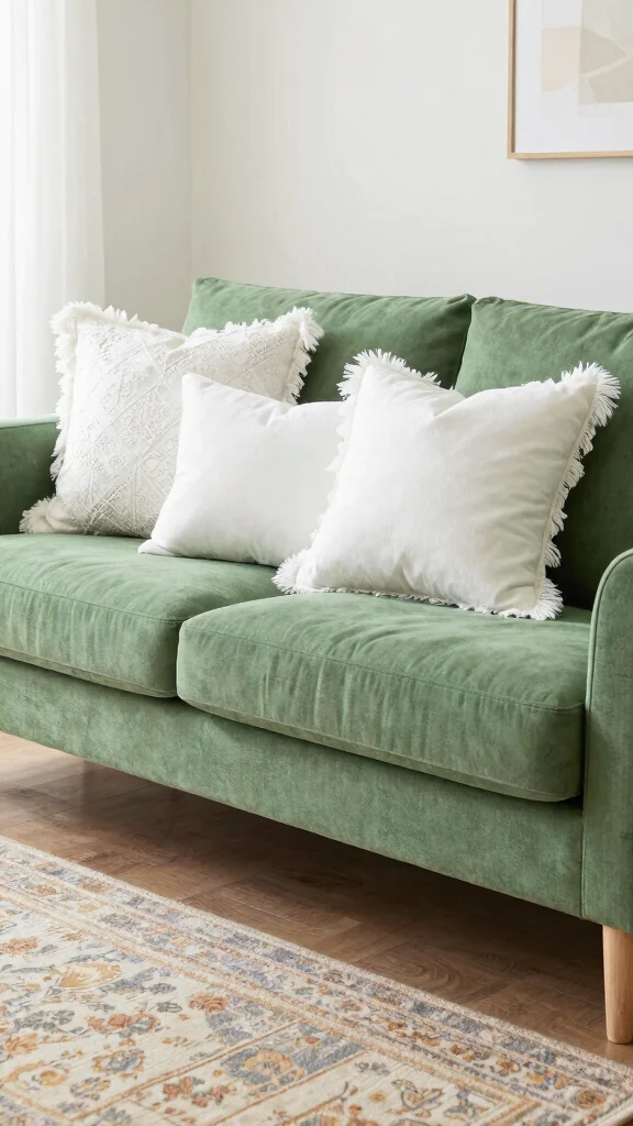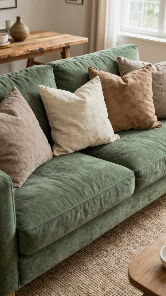 This enhances home decor ideas and throw pillow styles on a green couch; ensure the textiles complement the underlying green rather than compete with it.