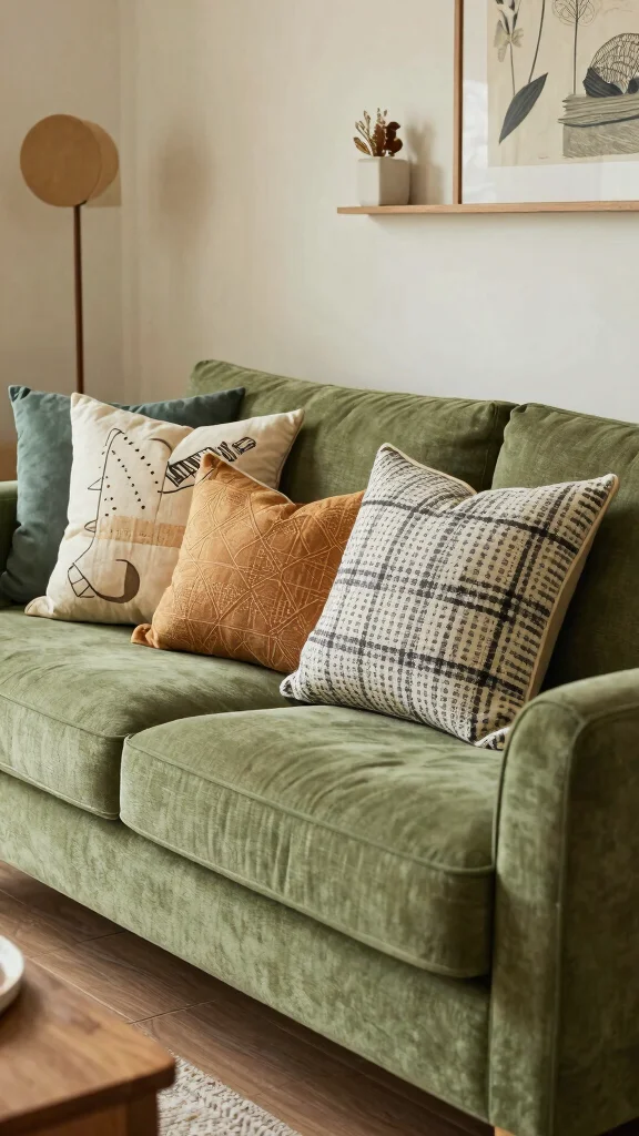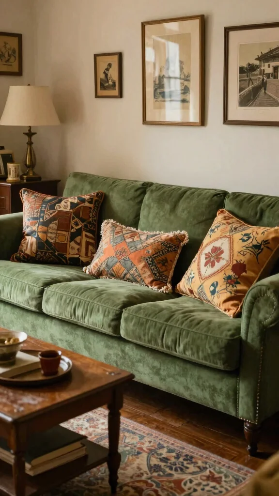 Combine vintage pieces with modern pillows for an eclectic look that feels fresh and inviting. Thrift stores and flea markets are great places to discover these special finds. Ensure the colors complement your green couch while still standing out.