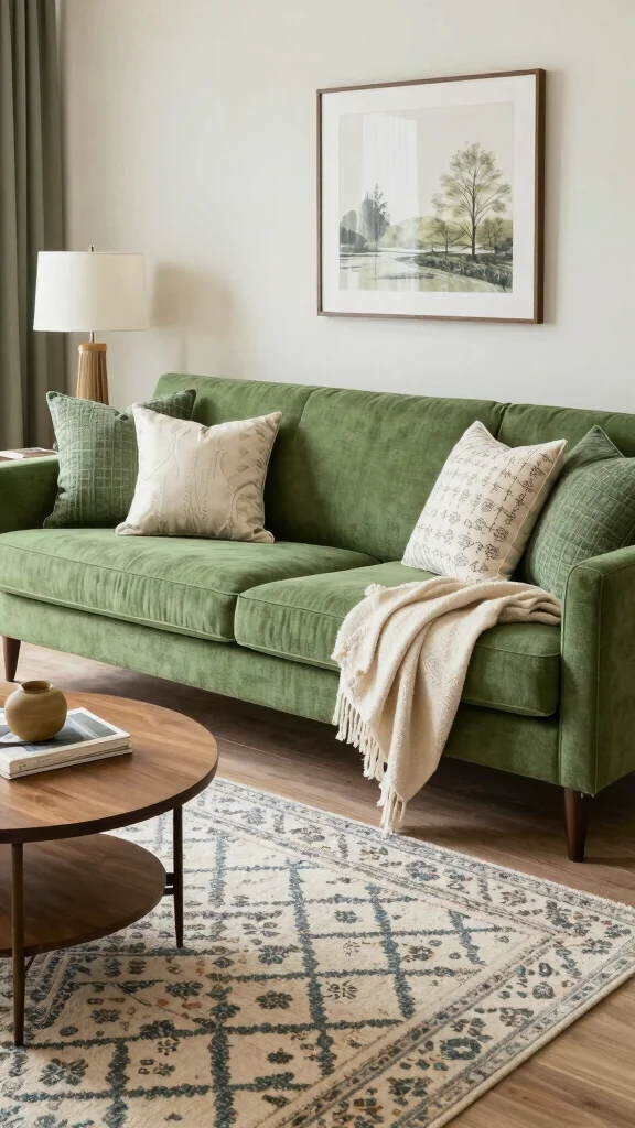 Fun fact: pairing earthy neutrals with a green couch can boost a room’s calm vibes by nearly 40%. Layer taupe, cream, and brown throw pillows for green couch to create texture and balance without overpowering the color.