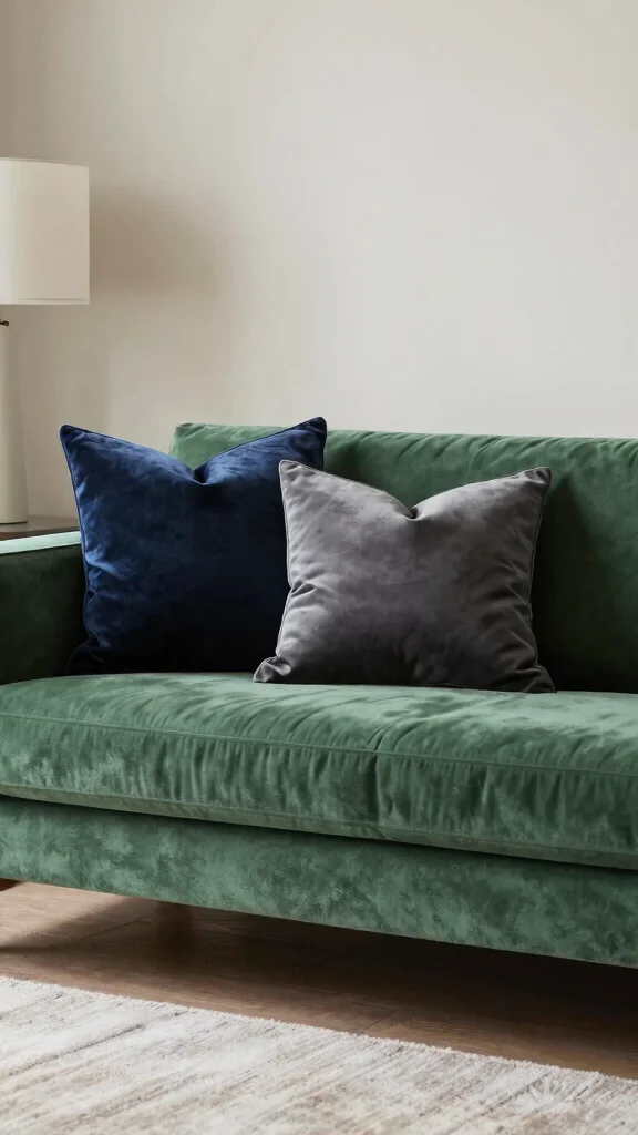 Dark hues like navy and charcoal can instantly elevate your throw pillows for green couch. Mix velvet textures with light accents to keep contrast inviting, not moody. Practical tip: start with one bold shade and layer softer tones for depth.