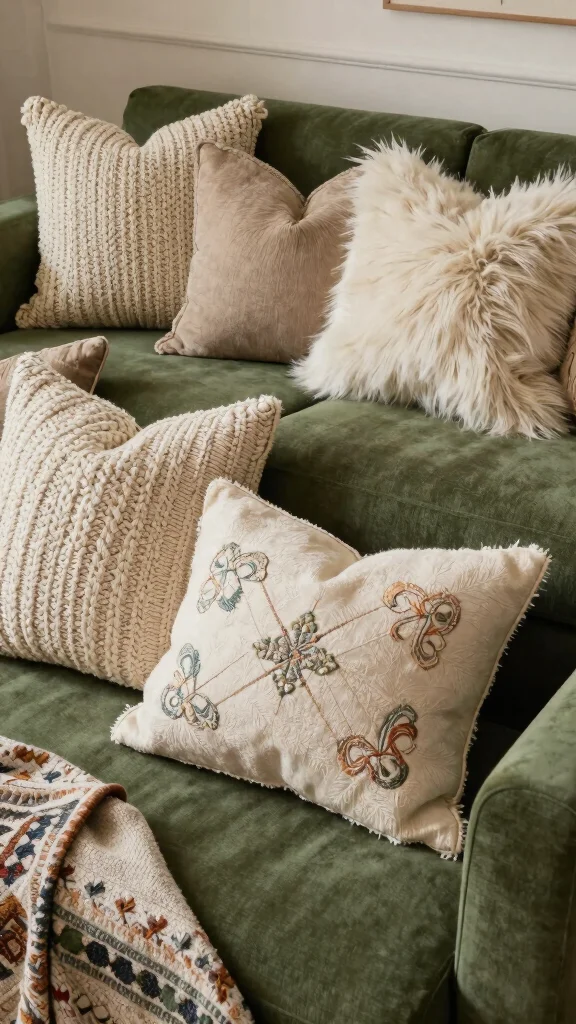 Incorporating a variety of textures into your throw pillows can elevate your green couch to new heights. Consider pillows made from knits, furs, or embroidered fabrics to create a rich tactile experience that invites you to relax. This layering of textures adds both warmth and visual interest to your space.