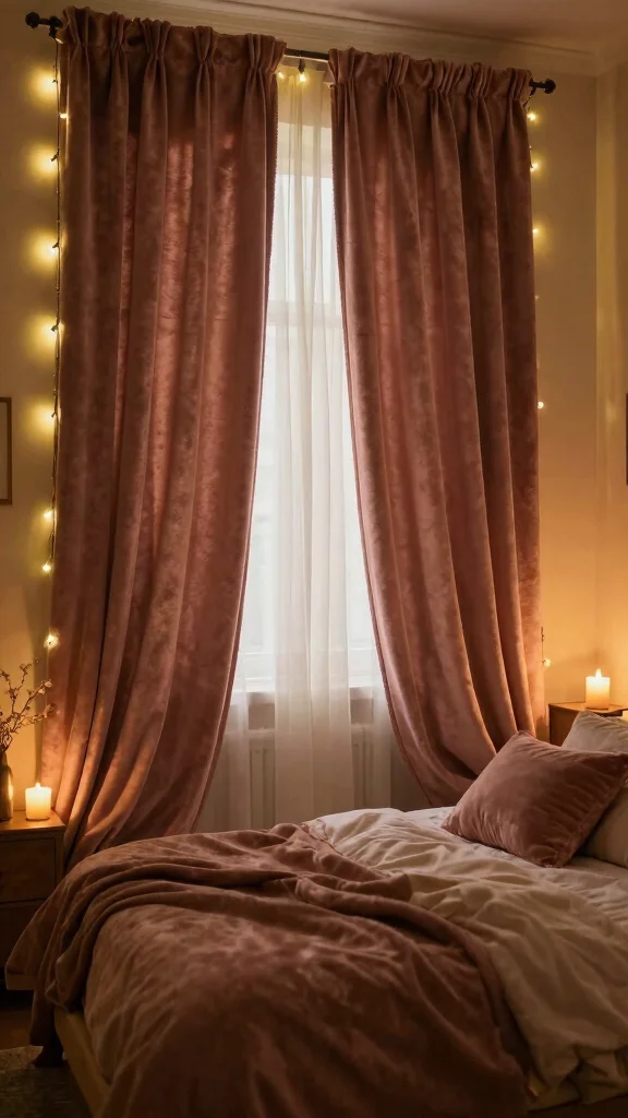 Velvet curtains can enhance the romantic vibe of your bedroom, particularly when paired with soft, warm lighting. Consider using gentle illumination to create a cozy glow, perfect for evenings. Backlit curtains can produce a dreamy effect, making your space feel enchanting.
